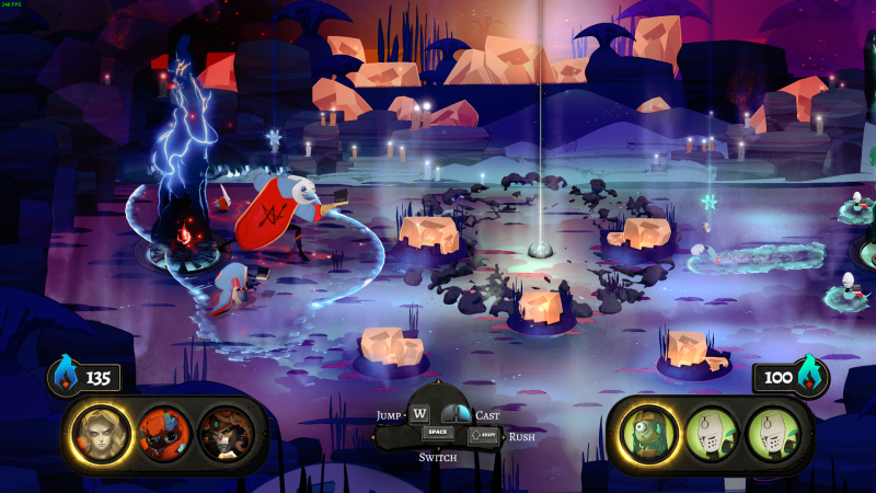 actions within the bout. Each team in the Rite starts off with a default 100 points for their Pyre, with some characters being able to bring in artifacts that increase that number, or decrease it later in the game by using titan stars (Think of them as willingly applied debuffs in exchange for more EXP in the Rite.). The goal is to hurl the orb and most the time yourself, into the enemy's pyre in an attempt to extinguish it. Once a team reaches zero, their Pyre is extinguished and the Rite is over. Each team’s exiles (Remember you chose to field three from your roster) come with their own unique abilities, this can range from some members being able to dash at incredible speeds, take flight or even turn themselves into a small bomb, temporarily banishing your foes. If I had to equate the Rites to a real-world sport, it would be Handball, if they allowed full contact. While in contact with the ball, your exile is essentially defenceless. They are able to use their movement abilities to get around but if they are hit by an opposing player's aura, or aura blast, they will be banished for a few seconds before returning to the field. While early game it’s quite easy to just pick a faster character like Rukey or Sir Gilman and essentially have them single-handedly run the game like Lebron playing against a bunch of school kids, but as the game progresses, they satisfyingly layer on various character mechanics to make the Rites more complex and challenging, really giving you a sense of mastery over your Exiles. It’s this complexity that really gets you thinking actively about what three exiles you’re going to send out into the Rite as each team has its own unique characteristics and playstyle, making learning to counter pick your opponent’s composition an important aspect of the game.