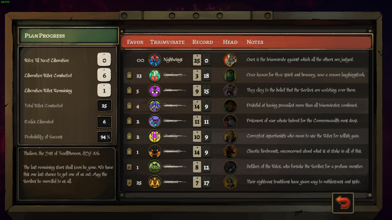 It's the sports section of the game that really gives you that unique Supergiant action RPG feel, rather than some pretty looking (And phenomenally sounding) visual novel. Not that I have anything against visual novels, it’s just that when I think Supergiant, I usually think of more action-heavy games à la Bastion or Hades. This had me thinking, maybe this was one of the main reasons that Pyre just didn’t rank so high on people's Supergiant top five list. Perhaps they were offput by the heavy visual novel element of the game? I mean according to steam achievements, only 34% of players managed to Liberate (Gain an exiles freedom) a single party member, which is a shame, because it’s from after that moment that the training wheels really come off. Your opponents begin to improve, gain better artefacts and overall, just play a lot better than they initially did on your first encounter. I’d also say this is when the Lore building really gets interesting. Up to this point, you learnt mostly about the world and how it works through conversations with other characters and reading the book of Rites, but on the second go around, you start to learn about the main cast of characters and why they are here in Downside fighting for their freedom.
